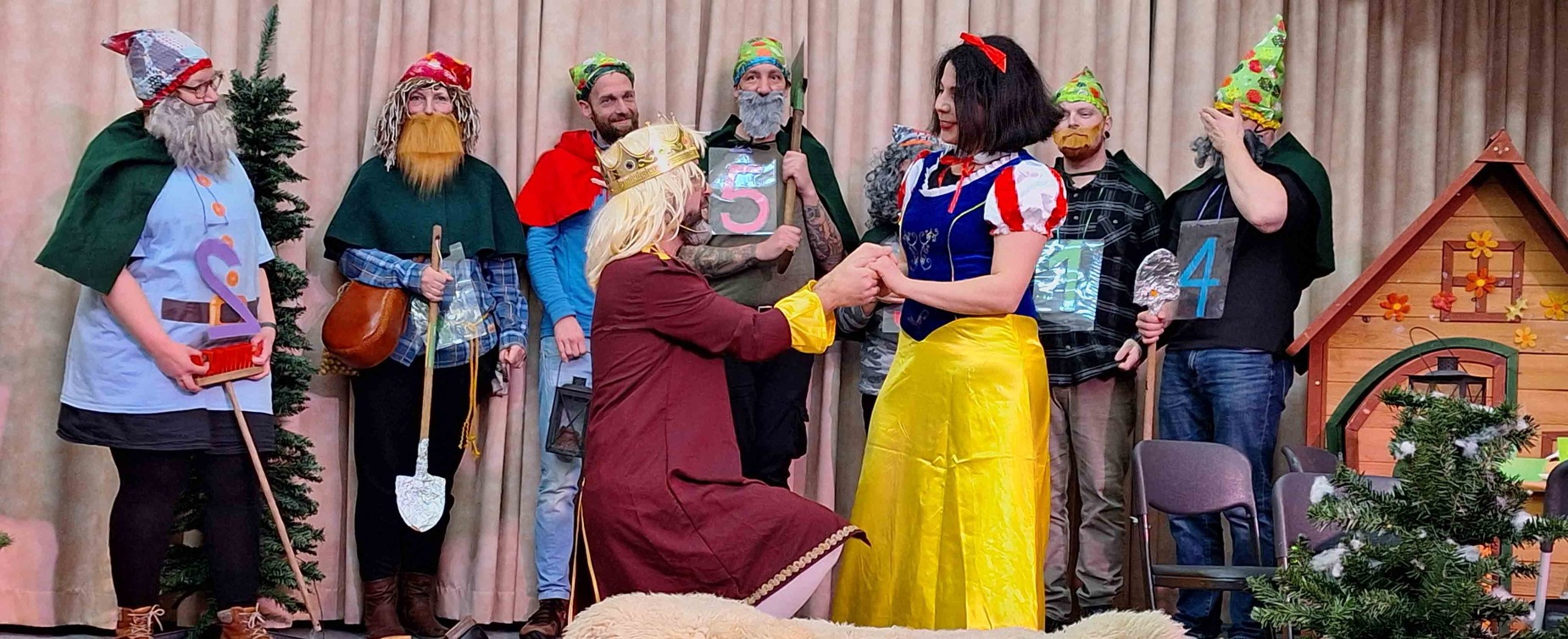 Zuerst mussten die Kinder anhand der Gestaltung der Bühne erraten, welches Märchen aufgeführt wird. Das Bild einer Burg hing auf einem Stoffplakat an der Wand. Zudem war ein großer Spiegel aufgehangen. Eine kleine Waldhütte war aufgebaut. Erkannt haben die Kinder das Märchen schließlich an dem Tisch, auf dem die sieben Becher, sieben Teller, sieben Löffel usw. aufgestellt waren. Das Erkennen war begleitet durch einen großen Freudenschrei.